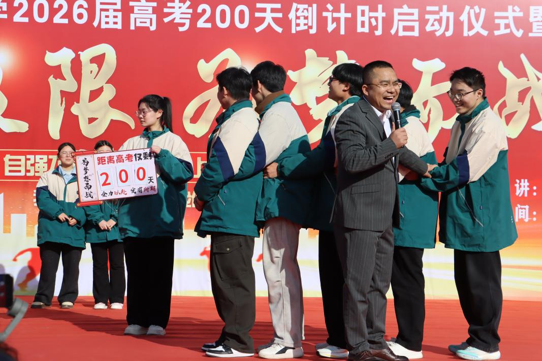 学校领导宣布高考200天倒计时正式启动,并发表热情洋溢的致辞,鼓励同学们以最昂扬的斗志、最坚实的步伐,冲向高考这一人生重要关隘。接着,领导向各班授予高考倒计时记录牌,象征着高考的脚步越来越近,同学们的备考也进入了关键阶段。